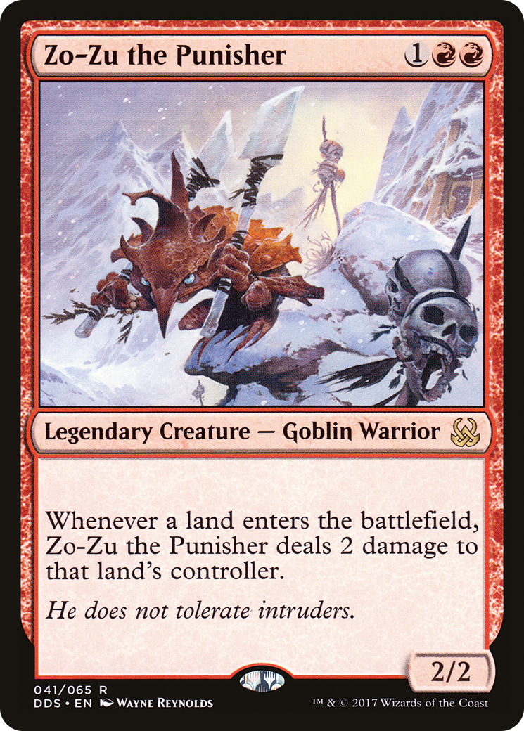 Whenever a land enters, Zo-Zu the Punisher deals 2 damage to that land’s controller.